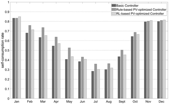 Comparison of monthly self-consumption rates of basic controller, rule-based PV-optimized controller, and RL-based PV-optimized controller.