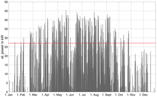 When PV optimization is used, only in transition periods and during the summer, the self-consumption can be significantly increased by up to 29% in May, but there is no improvement in winter. The reason for this is that, in winter, the PV surplus does not reach the minimum electricity consumption of the heat pump of 27 kW as shown in Figure 6, so the heat pump is not switched on to use it. Only approximately 5250 kWh/a of the total 34,900 kWh/a of PV surplus can be used by the heat pump. Thus, there is still potential for a battery storage to better match electricity demand and generation, e.g., by shifting PV electricity from day to night.