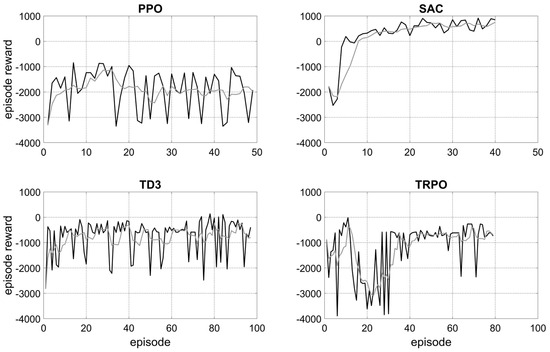 Convergence was observed for only three trainings. These cases also show the highest average episode rewards. For the agents without PV optimization, the soft actor–critic (SAC) method achieved the best results. For the agents with PV optimization, two methods achieved very good results: the SAC and the trust region policy optimization (TRPO) agent. According to these results, three annual simulations were performed (Section 3.2.2).