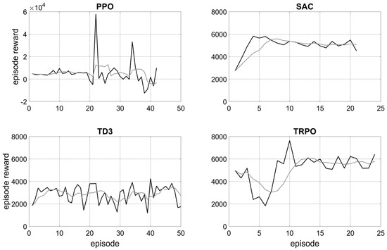 For each agent, training was performed, and the reward obtained, averaged over five episodes, as well as the fluctuation of the episode rewards shown in Figure 7 and Figure 8 were analyzed to determine if the learning process converges. Table 4 and Table 5 compare the average rewards over the last five training episodes between the algorithms used and give an assessment of convergence.