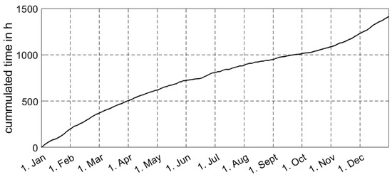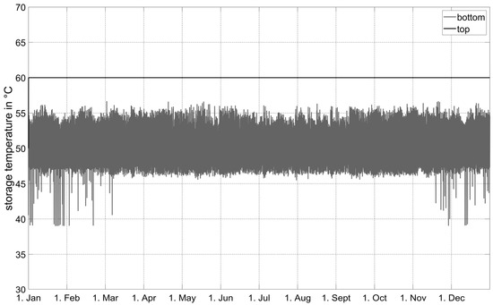 Further analysis showed that the backup controller intervened a total of 1415 h per year. As shown in Figure 10, intervention happened more often (bigger gradient) in winter to switch on the heat pump when the top storage temperature became too low than in summer (smaller gradient) to switch the heat pump off when the bottom storage temperature became too high.