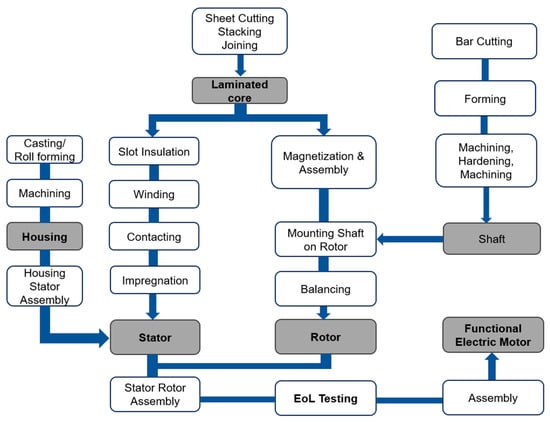 An overview of the manufacturing process of an e-motor is represented in Figure 2.