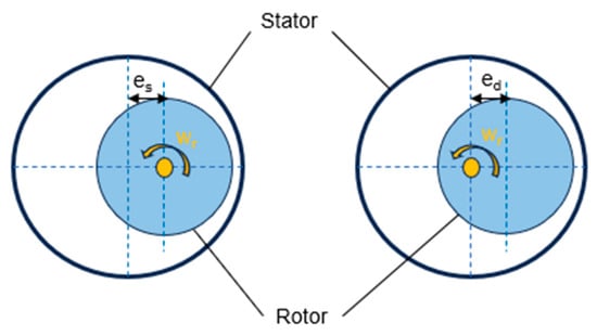 Rotor eccentricity is a prevalent issue in PMSM, primarily resulting from errors during manufacturing or installation and wear in the bearings. Rotor eccentricity can also arise due to manufacturing imperfections such as distorted or oval-shaped stator cores, bent or misaligned rotor shafts, bearing misalignments or defects, and an uneven air gap length around the circumference [15]. Depending on the alignment of the stator axis, rotor axis, and rotating axis, rotor eccentricity can be categorized into two forms: static eccentricity (SE) and Dynamic Eccentricity (DE). SE happens when the rotor axis aligns with the rotating axis but deviates from the stator axis. DE happens when the stator axis aligns with the rotating axis but deviates from the rotor axis. Figure 3 illustrates the schematic representation of SE and DE. Es and ed represent the length of eccentricity for SE and DE, respectively [39].