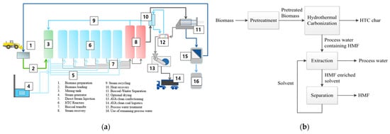 (a) AVA-CO2 HTC process design for one unit [92]; (b) AVA Biochem HTC method for hydrochar and HMF production [94].