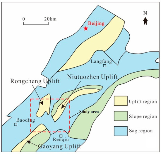 The target area of this study is the northernmost part of Baiyangdian in Xiongxian, Anxin and Rongcheng counties, Hebei Province. It is located in the southwest of the prominent elevation in Niutuo Town, situated in the hinterland of the Beijing–Tianjin–Baoding triangle. The Niutuo Town elevation is in the northeast part of the Jizhong Depression, constrained by the Niudong Fault, Rongcheng Fault and Niunan Fault, surrounded by depressions. It has a NE (northeast, 45°) to NNE (northeast, <45°) trend, forming an arc. The western part is the Rongcheng elevation, the northern part is the Langfang-Gu’an depression and the northeast and east are the Wuqing and Baxian depressions. The southern part includes Raoyang, the Gaoyang elevation and Baoding depression (Figure 1). Intense geological tectonic movements have caused geothermal anomalies in the region. The central part of the Niutuo Town elevation has bedrock buried at an average depth of about 1000 m, with the shallowest depth in Daying Town, where the burial depth of the Wumishan Formation is 493.85 m. Through depressurization experiments on multiple geothermal wells on-site, the burial depth of groundwater is determined to be between 23.3 and 71.24 m.