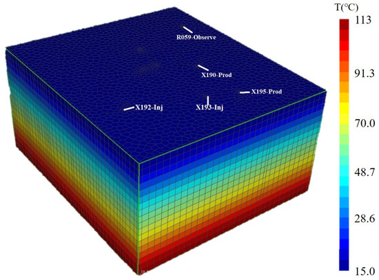 The initial temperature field of the model was set based on the temperature gradient (∆T). The top of the model was set to the average ground temperature (Ts = 15 °C) in the study area. The bottom borehole was set to be thermally insulated and the sides were open boundaries. The initial temperature inside the wellbore was consistent with the surrounding rock. After reinjection began (t > 0), the temperature at the wellhead was set to Tin.