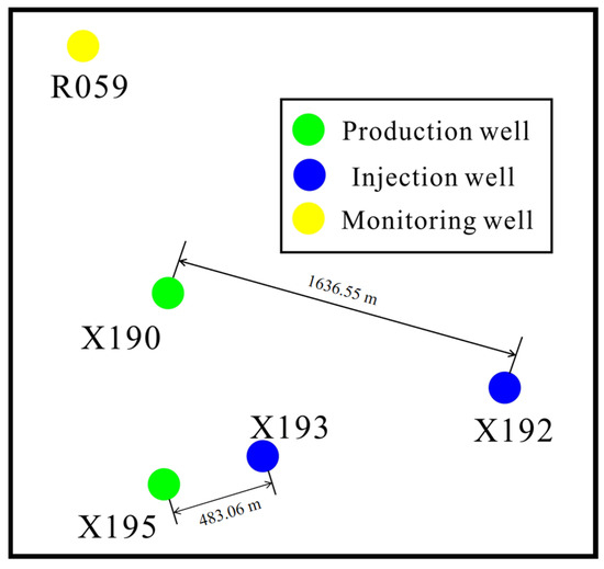 The target study area has a total of five geothermal wells available, as shown in Figure 3. According to the overall project plan and actual site conditions, the “double production and double injection” extraction mode is adopted in this study. Wells X192 and X190 are a set of extraction and reinjection wells. Wells X193 and X195 are another set of extraction and reinjection wells. R059 serves as a monitoring well, with its temperature data used for model verification and extraction optimization. The specific extraction and irrigation allocation as well as geothermal well parameters are shown in Table 2.