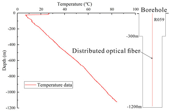 The observation well R059 was used for temperature monitoring using a DBDTS-2000 (manufactured by Tianjin Xingtong Jiuheng Technology Co., Ltd., Tianjin, China) distributed fiber optic temperature measurement system. The temperature evolution with the depth and time of the well R059 was obtained during the operation and intermittent periods. The evolution of the geothermal gradient in monitoring well R059 is shown in Figure 4. The temperature at the bottom of the well was 85 °C. The study area has superior ground temperature conditions. The temperature monitoring results can provide a basis for model establishment and validation.