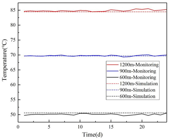 After a numerical model is established, it needs to be checked for accuracy. Thus, numerical simulation results need to be compared and verified with field test data. After the completion of drilling in the geothermal wells, heat extraction was carried out. The temperature evolution was measured based on the distributed fiber optic sensors. In this model verification process, the extraction and injection rates were set to those during the heat extraction, with a runtime of 30 days. Temperature data at depths of 1200 m, 900 m and 600 m were compared with the monitoring temperature. The temperature evolution at different depths in the monitoring well compared with the simulated results at the corresponding locations is shown in Figure 5.