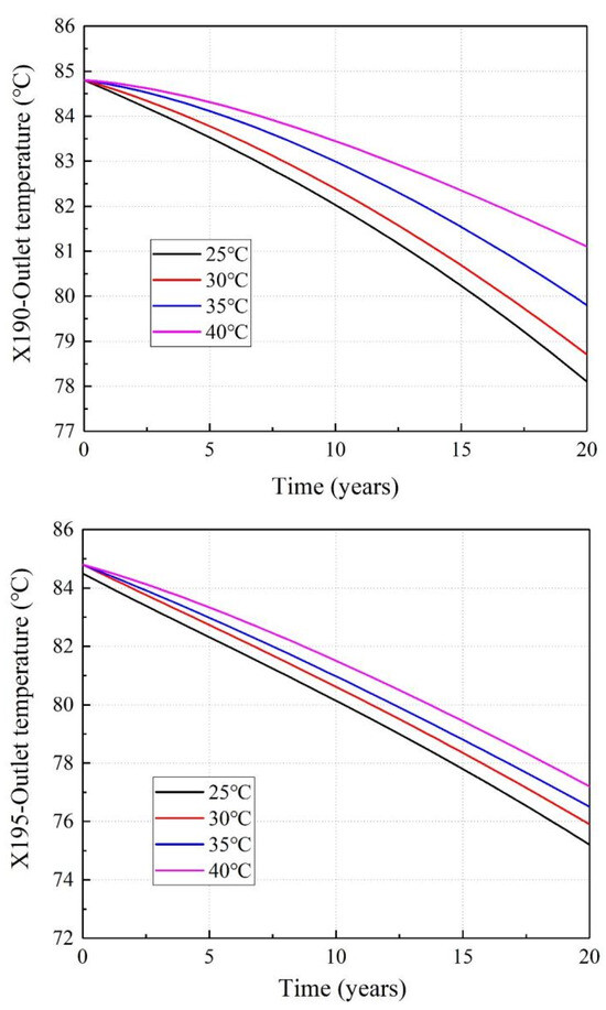 The reinjection rate of the injection well was 30 kg/s, and it is considered that the tailwater after heat exchange was completely reinjected. The variation of the outlet temperature after operating for 20 years is shown in Figure 6.