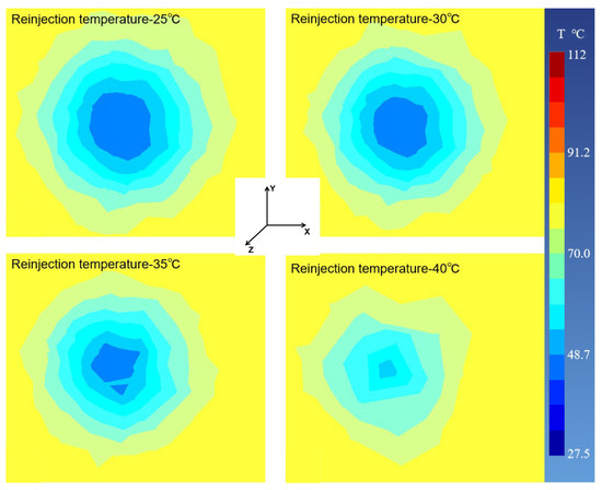 Since the depth of the four wells was generally around 1100 m, the temperature field at a depth of 1100 m underground was selected to represent the effect of different reinjection temperatures, as shown in Figure 7. As the reinjection temperature increases, the temperature impact range around the production wells gradually decreases. For well X192, with an increase in the reinjection temperature, the temperature impact scopes after 20 years were 210.3, 198.5, 185.6 and 179.3 m, respectively. This result indicates that raising the reinjection temperature can reduce temperature disturbances in the reservoir during the production process, ensuring the continuous operation of geothermal production activities. According to engineering experience, a reinjection water temperature of around 25 °C is the lower limit reached. Therefore, low-temperature reinjection water will not have a significant impact on this project.