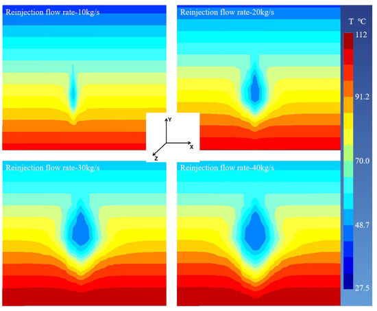 Increasing the fluid reinjection rate during the extraction process can significantly enhance the production of hot water. However, due to the limitations of geothermal reservoir conditions, extracting large quantities of geothermal fluid in a short period can substantially alter the underground temperature field. Therefore, it is essential to control the reinjection rate within a reasonable range. Based on the geothermal well extraction experiences in the Xiong’an region, the reinjection rates were set at 10, 20, 30 and 40 kg/s during the operation process to analyze the effects of different reinjection rates. To better illustrate the impact of different injection rates on the reservoir, tailwater of 30 °C was set in the simulation. And a 100% reinjection ratio was considered.