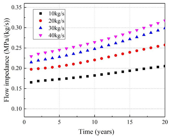 Flow impedance can reflect the difficulty of groundwater flow in the thermal reservoir. Flow impedance during the extraction process increases with the rise in reinjection rate, which is shown in Figure 10. Flow impedance during production mainly includes friction between the fluid and the wellbore of the reinjection/production well, and the resistance as the fluid flows through the geothermal reservoir toward the production well. When the reinjection rate was high, a large amount of low-temperature fluid was injected into the reservoir, continuously carrying away heat from the reservoir, causing an overall decrease in reservoir temperature. As the temperature decreases, fluid viscosity increases. The greater the internal frictional resistance that needs to be overcome during fluid motion, the higher the increase in flow impedance.
