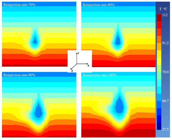 For different reinjection ratios, well X192 exhibited similar characteristics in the temperature influence range in both the horizontal and vertical directions in the reservoir, which is shown in Figure 12. Specifically, higher reinjection ratios led to larger disturbance ranges in the temperature field near the well. This is because, with a constant extraction flow rate in the production well, higher reinjection ratios result in a larger mass of low-temperature fluid being injected into the reinjection well in the same time period. The fluid absorbs heat in the reservoir, causing a temperature decrease in the horizontal direction of the reservoir. Additionally, the increased bottom pressure in the reinjection well due to a high reinjection ratio accelerates the downward movement of fluid, leading to a temperature decrease in the vertical direction around the reinjection well.