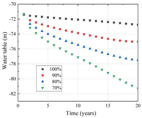 According to the requirements for geothermal resource extraction limitations, the decrease in groundwater dynamic water level during geothermal resource extraction should not be too large. In this study, the lowest groundwater level during each extraction cycle was selected to create a scatter plot, which is shown in Figure 13. The different reinjection ratios have a significant impact on groundwater level changes during long-term extraction. Lower reinjection ratios resulted in a faster decline in groundwater levels. After 20 years of extraction, the groundwater levels with reinjection ratios of 70%, 80%, 90% and 100% decreased to 81.28 m, 77.47 m, 75.01 m and 72.76 m, respectively. This result indicates that reinjection requirements should be increased in practical extraction processes. Higher reinjection ratios can minimize interference with surrounding groundwater and reduce the environmental impact of the project.