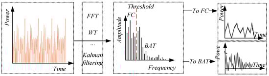 To fulfill the requisite smoothness criteria for the output power in fuel cells, the energy management strategy based on frequency decoupling has been introduced and widely adopted in fuel cell hybrid systems [34]. The fundamental concept behind frequency decoupling is treating the power demand signal as a low-frequency signal combined with a high-frequency signal, with the two signals separated through signal processing. The isolated low-frequency signal is considered as the output power of the hydrogen fuel cell, while the high-frequency signal is deemed as the output power of the lithium battery.