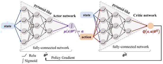 DDPG is a model-free, off-policy reinforcement learning algorithm designed for learning policies in high-dimensional continuous action spaces. It stems from the DPG algorithm and incorporates a deep function approximator, hence earning its name DDPG [35]. The effectiveness of DDPG relies on two key techniques. Firstly, experience replay enables the algorithm to learn from a set of unrelated content. Secondly, akin to the hard fixed Q-target network utilized in DQN, DDPG employs a “soft” target update for the actor-critic. This technique enhances training stability as the evaluation network updates more swiftly than the target network . The architecture of DDPG is depicted in Figure 4.