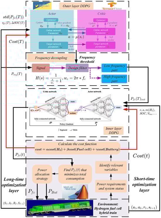In order to solve the problem of initial value dependence of reinforcement learning and difficult global optimization of global variables for energy management strategies, an enhanced energy management framework incorporating the frequency decoupling algorithm into the Deep Deterministic Policy Gradient (DDPG) is proposed. Initially, a decoupling algorithm based on the frequency of a low-pass filter is implemented to decompose the power demand signal of the train. Subsequently, a Two-Layer Deep Deterministic Policy Gradient (TL-DDPG) is employed to guide the power allocation of the fuel cell and battery. In this framework, the outer layer network integrates the frequency decoupling algorithm to provide an initial value for the optimization in the inner layer. Detailed elucidation of this approach will be provided in Section 3 of this paper. Test results under various operating conditions demonstrate that the proposed algorithm effectively reduces costs, enhances fuel cell efficiency and stability, and achieves superior braking energy recovery. Diverging from prior works, this paper comprehensively considers the attributes of the data-driven method, frequency decoupling, and rail transit operation. It deliberates on the energy management strategy from a data-driven perspective. The primary contributions of this work are summarized below: