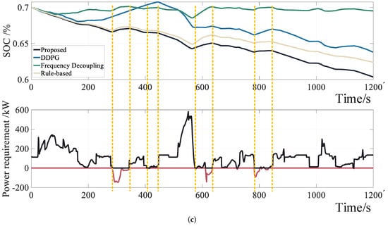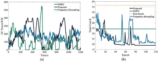 Additionally, Figure 9 showcases the superiority of the proposed strategy across various metrics. Figure 9a displays the output power curves of the fuel cell in the first training epoch for the proposed method, frequency decoupling, and traditional DDPG. It is evident that traditional DDPG generates initial values randomly during training, leading to volatility, longer adjustment times, and difficulty in finding the optimal solution. When using the frequency decoupling method, almost all power output comes from fuel cells, underutilizing lithium batteries. Our method employs the result of frequency decoupling as the initial value, enabling better learning of operating conditions’ characteristics. Notably, this represents only the first training session, demonstrating the effectiveness of our method. The final result is depicted in Figure 8d. Figure 9b illustrates the total cost of a single run using different energy management strategies, encompassing fuel cell start and stop costs, hydrogen consumption costs, and storage battery usage costs, as defined by Equation (12). Once training stabilizes, the total cost of our strategy is $18.86, lower than other strategies. The comparison also reveals that the proposed strategy outperforms traditional DDPG in terms of speed and convergence due to the consideration of initial value optimization. Figure 9c demonstrates the impact of different energy management strategies on the SOC trajectory, with the demand power curve attached at the bottom to illustrate the effect of braking energy recovery for each strategy. Our proposed strategy effectively enables the storage battery to absorb braking energy, showcasing the largest SOC variation range, indicating the strategy’s ability to stimulate the potential of lithium batteries while maintaining their performance. Figure 10a,b present the working efficiency of the fuel cell across different strategies, showcasing the advantages of the proposed strategy through two aspects: the average efficiency change of each epoch during training and the proportion of different efficiency intervals after training. The proposed strategy ensures the fuel cell operates mostly in the high-efficiency interval. Finally, Table 3 provides a comprehensive comparison of different strategies. Notably, while the rule-based strategy is relatively close to our strategy in indicators such as hydrogen consumption and SOC, it neglects the switching loss of fuel cells, resulting in a significantly larger final cost compared to other strategies.