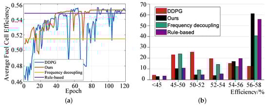 Comparison of fuel cell efficiency under different strategies. (a) The average efficiency curve of each training epoch. (b) Finished training, the proportion of efficiency intervals under different strategies.