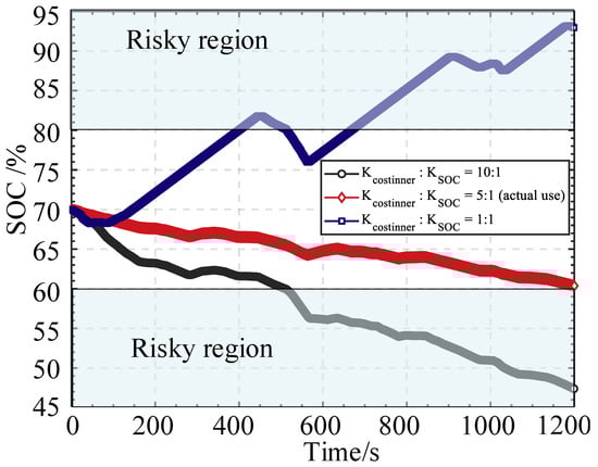 Figure 11 explores the impact of different reward expressions on the strategy’s learning efficiency and final policy when and in Equation (13) assume different values (essentially determining their ratio value). As observed, a reward function with greater emphasis on SOC sustenance tends to exhibit conservative behavior, underutilizing the battery buffer. Conversely, if more weight is assigned to minimizing hydrogen consumption, the final policy may breach the battery SOC constraint, causing the battery to enter the risky region in such instances. Simultaneously, adjustments to the weight of the standard deviation of the fuel cell output power, the difference between the initial and final SOC, and the average fuel cell efficiency should be considered. Given that the ranges of , , and are all confined within the 0–1 range (the fuel cell standard deviation has been normalized), the ratio values of , , and in Equation (15) are set to be equal.