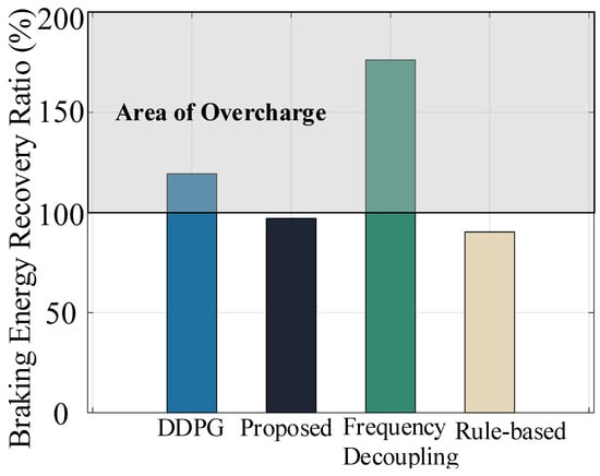 This section delves into further details concerning fuel cells and storage batteries. The frequent start and stop as well as the output stationarity of fuel cells are crucial factors influencing their lifespan and hydrogen consumption. However, traditional strategies often overlook the switching times of fuel cells and the smoothness of output power. Additionally, a significant portion of the energy generated by train braking is typically dissipated through braking resistance, leading to inadequate braking energy recovery in traditional strategies. Table 5 presents the standard deviation of switching times and output power of the fuel cell under different energy management strategies. It is evident that the application of reinforcement learning (DDPG and our strategy) reduces unnecessary switching losses and effectively maintains the smoothness of the fuel cell’s output power. Figure 12 illustrates the braking energy recovery ratio under different energy management strategies, calculated as the ratio of absorbed power by the battery to the total braking power. The proposed algorithm demonstrates the ability to maximize braking energy recovery. In contrast, the DDPG strategy and the frequency decoupling strategy encounter issues such as the battery absorbing energy from the hydrogen fuel cell, leading to overcharging.