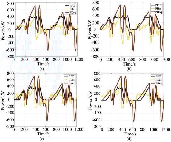 Power allocation under different EMS. (a) Rule-based EMS. (b) Frequency Decoupling. (c) DDPG. (d) Proposed method.