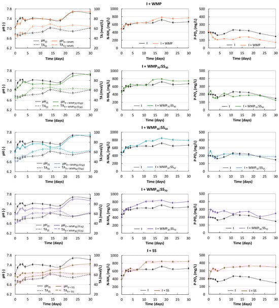 The changes in pH and TA in the supernatants from SS, WMP, and their mixtures are shown in Figure 1. The results were compared with those from I only. In general, the pH and TA of all variants increased slightly during MP from a pH value of about 7.0 to about 7.8 and from 40.0 to 95.0 mval/L of TA. This indicates that the conditions of MP were stable. As mentioned in Table 1 (Section 2), the initial pH and TA in the supernatant of I had the highest values compared to fresh SS and WMP. In the case of TA, the addition of substrates into I did not cause significant differences in this parameter either at the beginning of the measurements or during the process. The pH values in the supernatant of raw SS and in the water extract of raw WMP were 6.65 and 6.88, respectively. Thus, the addition of SS caused the pH to decrease, and the higher the content of SS the larger the difference between the pH values in I and the mixture. The changes in pH in the supernatant of WMP during the experiment were similar to those in I, with the pH increasing from 7.2 to ca. 7.7 after 30 days of measurements. The lowest pH was noted when SS was the only substrate. In this case, the pH in the supernatant of SS at the beginning and end of the measuring period was 6.9 and 7.6, respectively.