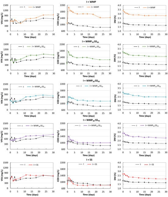 Figure 2 presents the changes in concentrations of COD, VFA, and the DM content during AD. The initial COD concentration in the supernatants of I and of WMP was similar at ca. 1100 mg/L. The addition of SS into the mixture with WMP caused this initial concentration to decrease, and its value was lowest in the supernatant of SS (approximately 878 mg COD/L). After 1 day, the COD concentration peaked in the supernatants of all variants, and it was highest in the supernatant of WMP, with a value of 2056 mg/L, followed by WMP70:SS30 (1730 mg COD/L) and WMP30:SS70 (1185 mg COD/L). After this, the COD concentration gradually decreased in all variants. After 30 days of MP, the COD concentration was highest in the supernatant of WMP (1433 mg COD/L) and lowest in the supernatant of SS (790 mg COD/L).