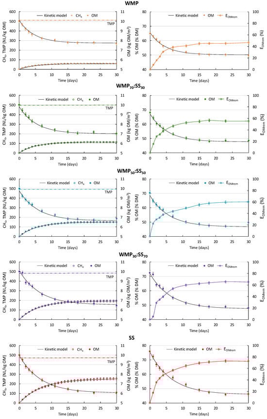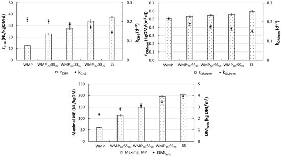There was a relationship between the parameters of MP kinetics (Figure 4). With WMP alone, the coefficient of MP kinetics (kCH4) was the highest of all the tested variants, at 0.211 d−1, and the initial rate of MP (rCH4) was the lowest, at 12.5 NL/(kg OM·d). With SS alone, in contrast, kCH4 was the lowest (0.146 d−1) and rCH4 was the highest (36.8 NL/(kg OM·d)). As the SS content in the mixtures was increased, rCH4 also increased, from 22.7 NL/(kg OM·d) with WMP70:SS30 to 33.8 NL/(kg OM·d) with WMP30:SS70. In contrast, kCH4 decreased from 0.201 d−1 with WMP70:SS30 to 0.174 d−1 with WMP30:SS70. A similar relationship between the parameters of OM removal kinetics was observed (Figure 4). The rate of OM removal increased from 0.51 kg OM/(m3·d) with WMP alone up to 0.59 kg OM/(m3·d) with SS alone, whereas the coefficient of OM removal decreased from 0.215 d−1 to 0.152 d−1. However, maximal MP and overall OM removal both increased simultaneously, i.e., greater production of biogas/methane corresponded to greater overall removal of OM content during degradation. This was mostly due to increases in the degradability of OM in the substrate for AD [36].