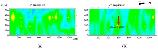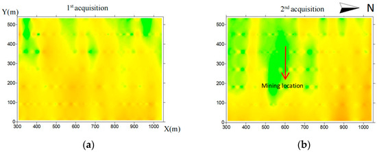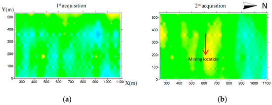 By taking the first exploration data before mining of the measuring line 2 as the background value and the difference inversion with the third exploration data in-mining and calculating and obtaining the change amount and change rate of two observation data, the location of the third acquisition was about 800 m north of the survey line.
