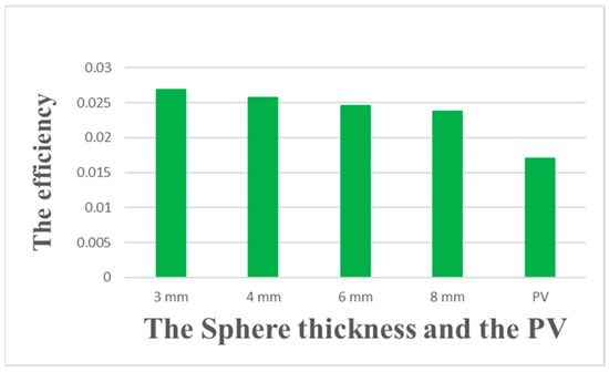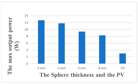 - When the thickness of the concentrated solar sphere is reduced by 1 mm, the output power rises by around 1 W. Moreover, the obtained efficiency was increased by decreasing the solar sphere thickness. The thinner the thickness of the acrylic layer, the more sunlight is absorbed by the acrylic photons and, subsequently, the higher efficiency.