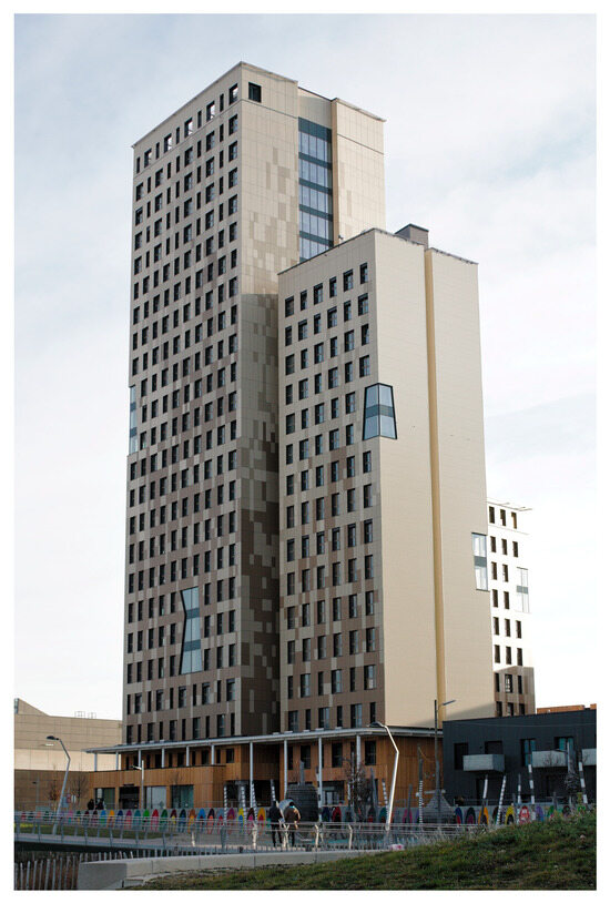On the ground floor of the building, premises with a commercial function are located, with residential units on the remaining floors. Each floor has two flats with loggias, separate lift entrances, and access to an automated car park with a capacity of 22 cars in the underground section of this building [40]. The north and south elevations are glazed, while the east and west elevations are designed to be ‘green’: planted with vegetation and equipped with an irrigation system. The residents of the building showed their satisfaction with living in Carbon12, complementing its aesthetic qualities: the bright colours of the façade and, in the interior, the prominence of natural materials, i.e., wood, which has a beneficial effect on human well-being. The benefits of lower utility and commuting costs have also been noted [40].
