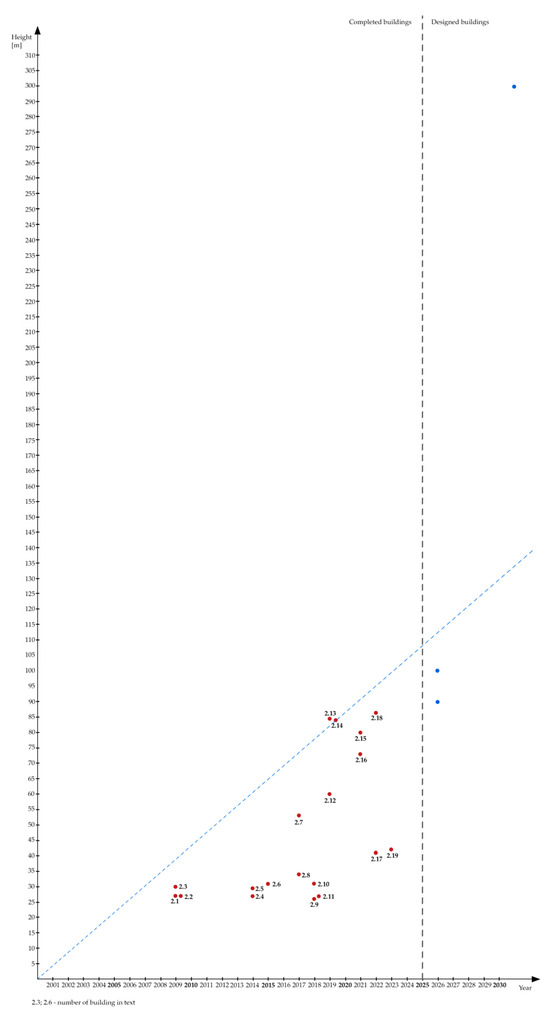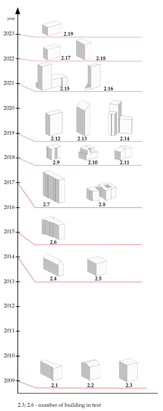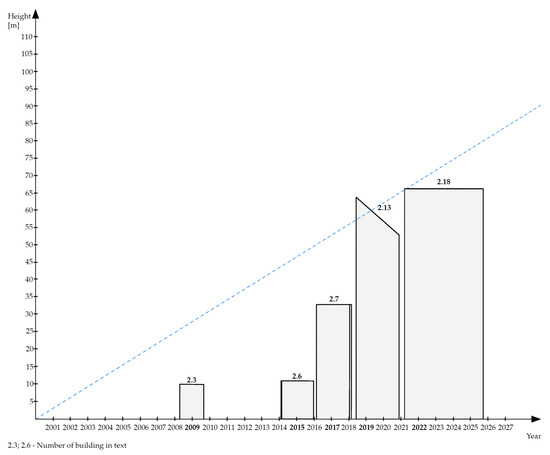 On the basis of the authors’ own analyses and literature research, as well as the information made available in online publications, it was concluded that timber load-bearing structures have been increasingly implemented in high and high-rise construction since 2000 (Figure 6). Previously, this type of structural material solution was used only in low- and mid-rise housing.