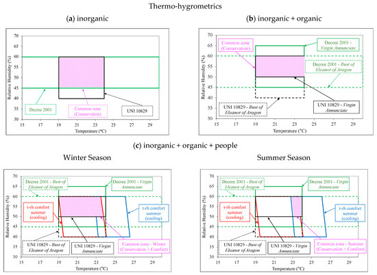 The evaluation of optimal indoor parameters presented in Section 2.1 starts from the assumption that in each room only homogeneous artworks are exhibited. However, in many cases of museums, various artworks of different kinds could be housed in the same room, which, in general, requires different indoor thermo-hygrometric parameters. Moreover, the presence of people, other than being an additional element relative to the maintenance of comfort conditions, constitutes an environmental disturbance that could contribute to the degradation process of the artwork. These conditions impose a more accurate evaluation of the limits of temperature and relative humidity of indoor air, in search of common areas within which the control of indoor environment parameters should be exercised.
