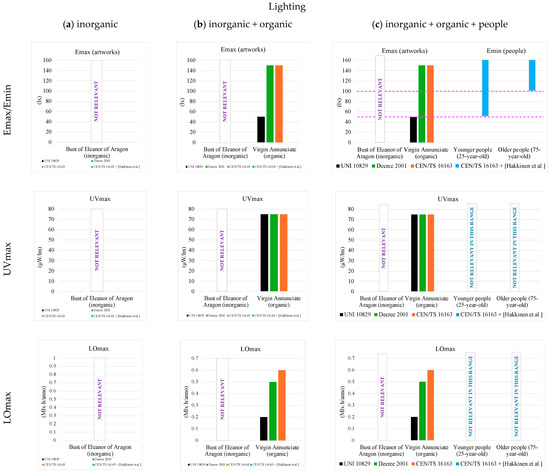 Light is a critical element in museums because it influences the visual presentation quality of artworks. However, either artificial or natural lights contain spectral components that can pose a risk to cultural artifacts [46]. Consequently, technical standards are deeply concerned with these museum features. Once again, the Italian regulations appear to be among the most detailed documents regarding this aspect. Specifically, the following lighting parameters are those considered by the Italian standard UNI 10829 [39] for optimal conservation: Emax maximum limit of luminance (lx), UVmax ultraviolet radiation maximum value (μW/lm), LOmax yearly dose of light (lx h/y). Table 4 shows the values given in the standard for each of the above-indicated parameters in the case of steady-state indoor climate conditions relative to the most relevant artwork materials, i.e., those found most frequently (and usually in the greatest number) within museums.