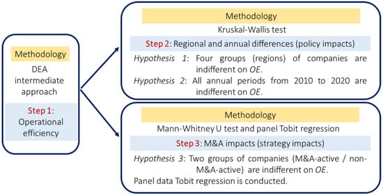35] that maintains both input and output production factors and determines the degree of OE by considering these individual influences. Step 2 performs a non-parametric (rank-sum) test to examine regional and annual differences in OE measures. Step 3 conducts a non-parametric test to examine the differences in OE between M&A-active and non-M&A-active companies. Step 3 also performs a Tobit regression analysis in which OI is a dependent variable.
