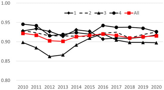 Table 4 indicates that Hypothesis 1 is rejected at the 1% significance level, and Hypothesis 2 is not rejected at the 10% significance level. That is, OE measures are different among the four regions, but do not show statistically significant changes over the study period from 2010 to 2020. Thus, regional differences are persistent and relatively important compared with temporal changes in