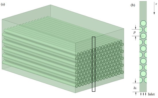 The considered TES unit is configured according to a staggered tube bundle heat exchanger, in which the PCM is filled inside the tubes, and the heat transfer fluid (HTF) flows outside from the unit bottom, as shown in Figure 1. The tube bundle consists of N groups of staggered tubes in the horizontal direction. Each group contains 10 staggered tubes, as shown in Figure 1a. Due to the periodic arrangement of tubes along the horizontal direction, the region shown in Figure 1b is selected for the numerical analysis. The 2D model was selected because it can significantly save computational time while ensuring calculation accuracy, considering that the tube length is much greater than the tube diameter. The height and width of the selected region are 500 and 40 mm, respectively. The inner and outer diameters of the tubes are 30 and 32 mm, respectively. The tube pitches in x- and y-direction (p) are 40.00 and 34.64 mm, respectively. The distance from the bottom tube to the unit bottom (hi) is 50 mm. For the purpose of enhancing heat transfer, the tube bundles oscillate along the vertical direction at a speed of v = A × sin(2w × t), where A and w are the oscillation amplitude and frequency, respectively. Paraffin wax is taken as the PCM since it is cheap and has excellent performance, such as noncorrosive, odourless, long-lasting, etc. []. Water is the HTF. The tubes are made of copper. Detailed thermophysical properties of the materials are summarized in Table 1.