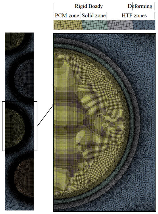 The oscillation of tube bundles was handled using the dynamic mesh technique. The spring-based smoothing method coupled with the re-meshing algorithm was adopted for the dynamic meshing. The geometrical model was then meshed using the ANSYS Meshing, which includes quadrilateral elements in the solid and PCM zones, as well as hybrid elements in the HTF zone. In the HTF zone, a concentric annulus region around the solid zone is established, and the quadrilateral elements are employed in this region, while the triangular elements are employed in the rest region, as shown in Figure 2. The annulus region was built with finer grids to capture the steep temperature gradient in the boundary layer and set it as the rigid body in the dynamic mesh set. The rest of the region of the HTF zone and its boundaries are set as the deforming type. The inlet and outlet boundaries are static zones. The rest zones and boundaries are the rigid body. The motion of the rigid body is programmed using user-defined functions (UDFs) in ANSYS Fluent for compilation, which sets the speed v = A × sin(2w × t) to every tube at the same time.