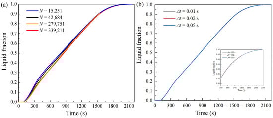 Effects of grid size and time step on the transient variation of liquid fraction at (a) different grid numbers and (b) time steps.