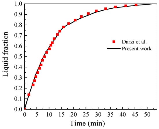 The present numerical model was validated by the numerical results reported by Darzi et al. []. It is noted that these numerical results were validated by experimental data reported by Dhaidan et al. [] by comparing the shape of melting fronts. In their study, N-eicosane was filled in an annular container with an inner diameter of 40 mm and an outer diameter of 80 mm. Four fins with a thickness of 1 mm and length of 15 mm were inserted into the PCM. The same physical model was adopted, and the simulation was then carried out using the present numerical model. The comparison of the evolution of liquid fractions calculated by the present model with their results is shown in Figure 4. It is seen that the maximum difference between the two liquid fraction curves is 1.1%, which validates the numerical model. The possible reason for the difference is that different mesh systems were used in the simulations, although both were demonstrated to be mesh-independent.
