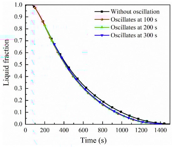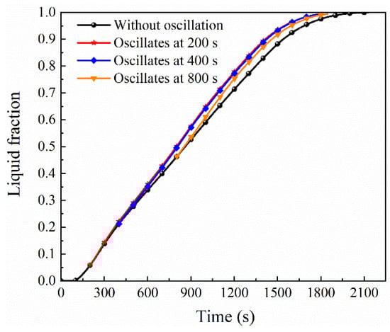 - The solidification process can also be accelerated by the oscillation of tubes, and the solidification times of the cases without oscillation, with oscillation starting at 100, 200 and 300 s, are 1444, 1338, 1345 and 1355 s, respectively. The effect of oscillation on solidification becomes significant at the later solidification stage as the liquid fraction curves show clear discrepancies at t > 400 s.