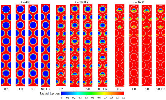 Liquid fraction contours for PCM at different oscillation frequencies.
