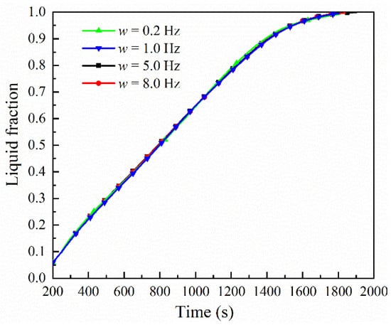The evolution of liquid fraction for cases with different oscillation frequencies is further shown in Figure 9. As seen, the liquid fraction curves with these four different oscillation frequencies are nearly identical, suggesting the oscillation frequency has little effect on the total melting amount of PCM. The high oscillation frequency (8.0 Hz) leads to a slightly higher liquid fraction at the former melting stage, as a high oscillation can better enhance heat convection with a small amount of liquid PCM. However, the low oscillation frequency (0.2 Hz) results in a slightly higher liquid fraction at the later melting stage and the main reason might be that a high oscillation frequency can suppress the convection as the liquid PCM is forced to move to the opposite direction too frequently. Finally, the PCM melts completely at nearly the same time with different oscillation frequencies, and the complete melting time of PCM with oscillation frequencies of 0.2, 1.0, 5.0 and 8.0 Hz are 1797, 1800, 1801 and 1803 s, respectively, indicating that the oscillation frequency has a negligible effect on the PCM liquid fraction evolution among the considered cases. This can be explained as follows: the acceleration of liquid PCM to a certain speed at a direction, i.e., the formation of convection, requires time, and a too-high frequency shifts the motion direction of tubes too quickly and thus prevents the formation of high-speed liquid PCM. Thus, a higher frequency does not further enhance the melting.
