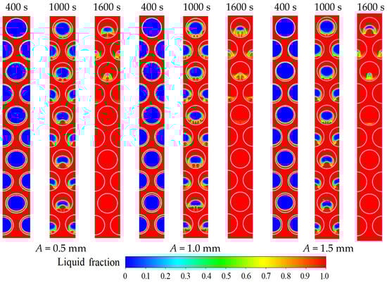 Liquid fraction contours of PCM at different oscillation amplitudes.