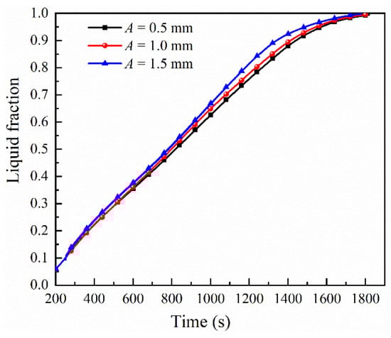 The evolution of PCM liquid fraction at different oscillation amplitudes.