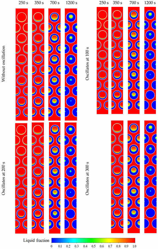 To examine the effect of oscillation time, the cases with no oscillation and oscillation starting at 200, 400, and 800 s were simulated, and the corresponding liquid fraction contours are shown in Figure 5. The oscillation frequency and amplitude are 1.0 Hz and 1.0 mm, respectively. For the case without oscillating, the solid-liquid interface moves nearly uniformly from the walls of the tube to the centres of the tubes before t = 400 s, indicating heat conduction is dominant at this stage. The PCM in the tubes near the bottom melts faster than that near the top since the HTF enters from the bottom. As the melting progresses, more liquid PCM is present in the tubes, and the natural convection starts to develop. As shown, natural convection brings the heat upward from the tube bottom, and a few high-temperature regions are formed in tubes near the bottom at t = 800 s, indicating that heat convection becomes important in the following melting process. For the case with oscillation starting at 200 s, it is seen that the high-temperature regions near the tube bottom are much larger than those of the case without oscillation at t = 800 and 1200 s, meaning the heat convection is intensified with the presence of oscillation. As a result, the PCM melts completely in more tubes with oscillation than without at t = 1600 s. With the starting of oscillation delays from 200 to 400 s, the high-temperature regions near the tube’s bottom become smaller since the convection heat transfer is later enhanced by oscillation. With the further delay of oscillation, the high-temperature region becomes even smaller, and larger solid regions are present in the tubes at the same time.