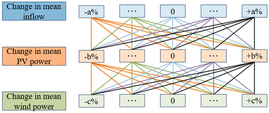 As a bottom-up simulation approach, the multivariate stochastic simulation method considers a range of the reservoir inflow, PV, and wind power. The change rate are all set to ±a%, ±b%, ±c%. Subsequently, the seasonal autoregressive (SAR) model based on the scaled inflow series was used to obtain the uncertain inflow scenarios. Copula functions are then used to construct joint probability distributions between the inflow series and PV/wind power output series. By using the joint probability distributions and Latin hypercube sampling (LHS) [25,26], the uncertain PV and wind power scenarios are simulated. Finally, the simulated inflow, PV, and wind power series are combined to generate a large number of uncertain scenarios (see Figure 1).