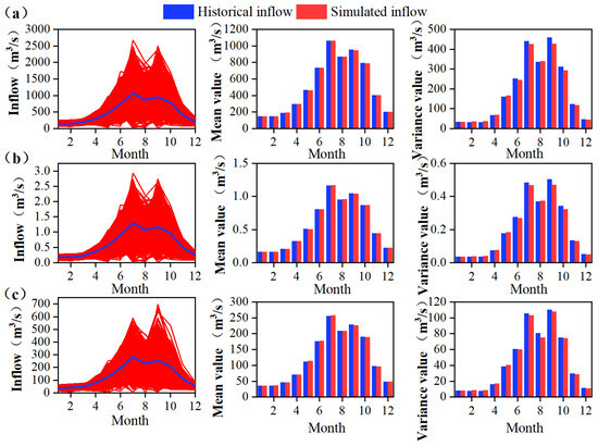 Figure 3 illustrates that compared with the historical inflow series, the distribution range of the simulated inflow has expanded, while still maintaining consistent statistical characteristics with the historical inflow series. The mean and variance are statistical features of the runoff time series, where an increase or decrease in the mean indicates an increase or decrease in the available storage of the reservoir. An increase in the variance suggests greater interannual fluctuations in the monthly reservoir inflow series. The simulated inflow series exhibits mean and variance parameters that are consistent with the historical inflow series in each month, thereby validating the rationality and effectiveness of the SAR model developed in this study.